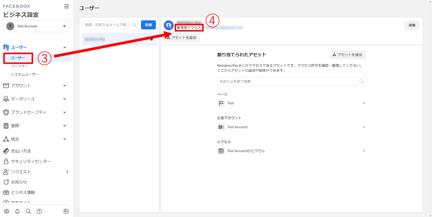 次に、ドメインを所有しているビジネスマネージャの「管理者」であるかを確認します。前述したように、各種アセットを広告主側で揃える場合、こちらの作業は広告主側で行うものになります。
