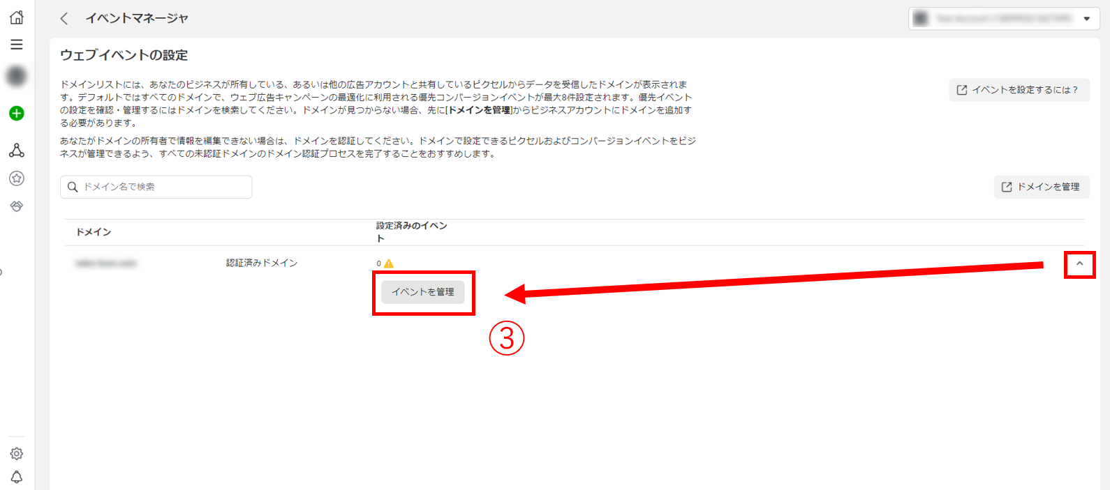 ③対象のドメインをクリックした後、[イベントを管理]を選択