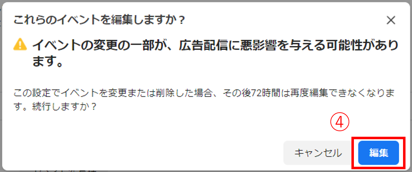 当初はイベントを編集すると広告アカウントの72時間の強制停止期間(クールダウン期間)が発生しましたが、現在は撤廃されています。しかし、停止はされずともイベントの優先順位を変更できる頻度が72時間に1回になったため、イベント編集後は数日間は変更を加えられなくなるので気をつけましょう。
