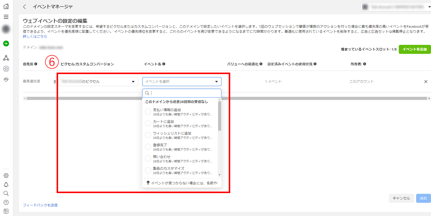 ⑥[カスタムコンバージョン]、[ピクセル]のいずれかを選択し、対象のイベントを選択