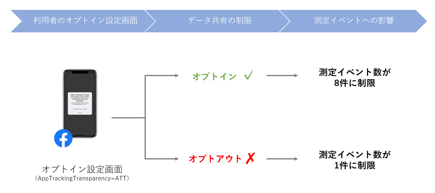結果、Facebookを含むiOS上の全てアプリでコンバージョンの測定やターゲティングの最適化に大きな影響が生まれてしまうため、関係するアプリ広告主・ウェブ広告主は大きな打撃を受けてしまいます。