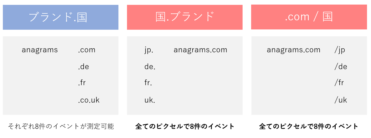 まず、合算イベント測定に設定できるイベントは1ドメインにつき最大8件となりますが、この制限はプライマリードメインに適用されるため、配下のサブドメインもすべて含まれる形となります。例として、jp.anagrams.comとuk.anagrams.comはサブドメインで分かれていますが、プライマリードメインのanagrams.comは同一となるため、全体で設定できるイベント数は最大8件となります。そのため、ポータルサイトであったり、グローバル展開しているサイトなど、複数のサブドメインでサイトを運営している企業は注意が必要です。