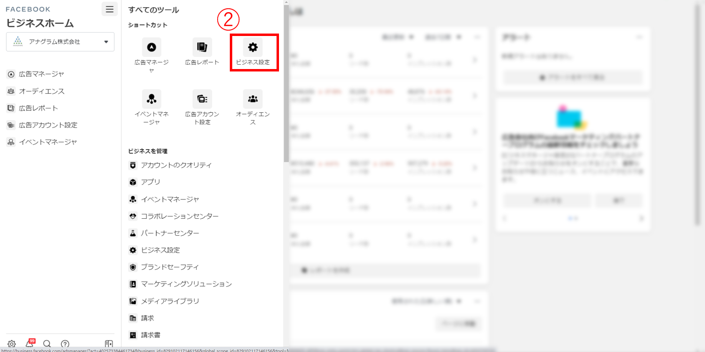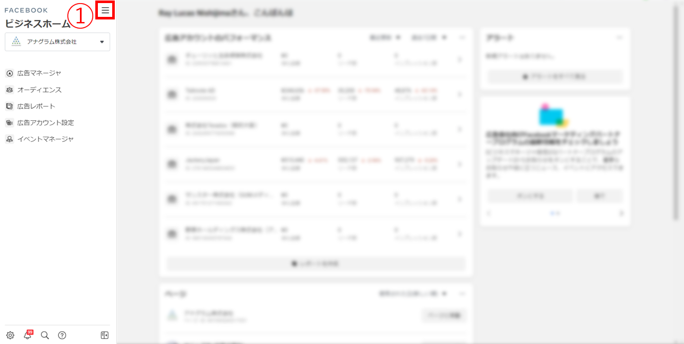 ①ビジネスマネージャーにログインし、左上のメニューボタン「≡」をクリック
