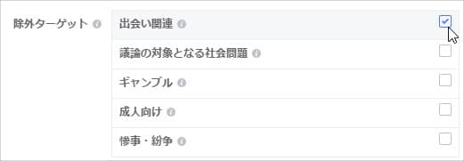Facebook広告の配信先から除外できるカテゴリは、これまで下記のように提供されていました。