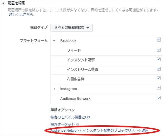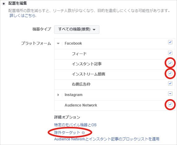 配信先に、オーディエンスネットワーク、インスタント記事、インストリーム動画のいずれかを選択している場合は「除外ターゲット」の指定が可能になります。