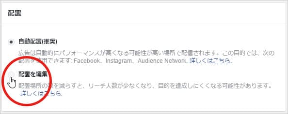 除外設定の手順を紹介します。除外設定は広告マネージャやパワーエディタの広告セット編集画面にある「配置」より行います。