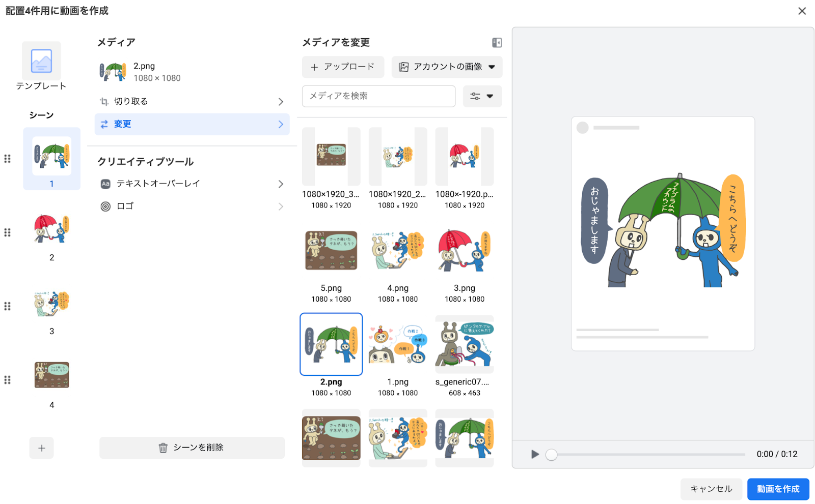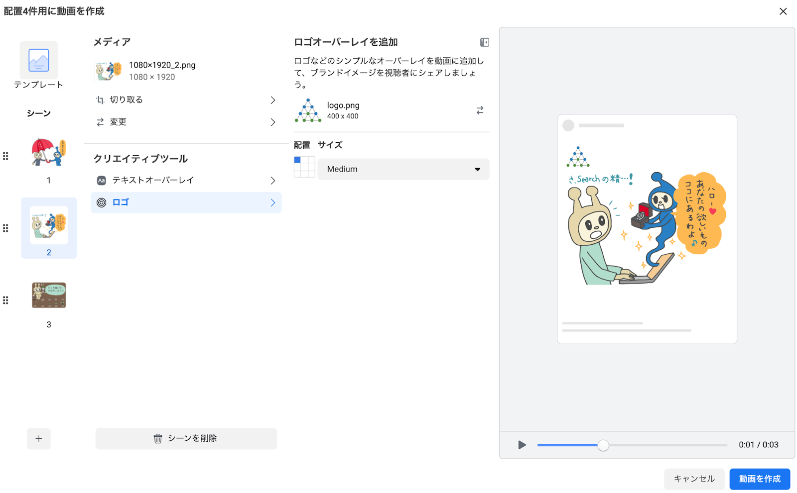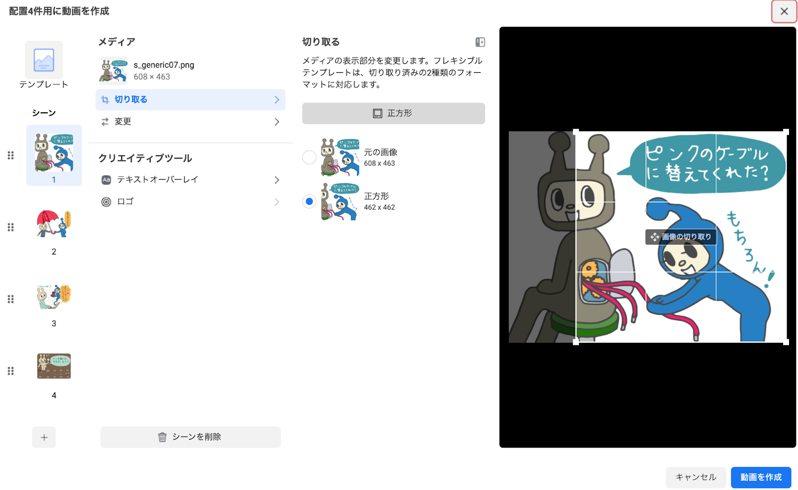 簡単な動画であればFacebook広告の管理画面上で作成から入稿までできる、非常に便利なツールです。