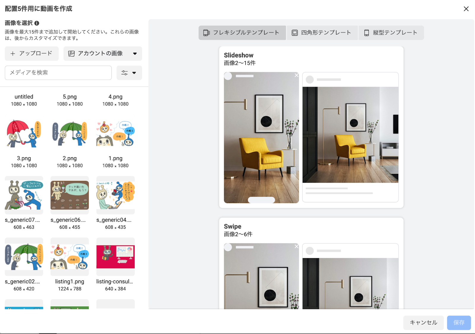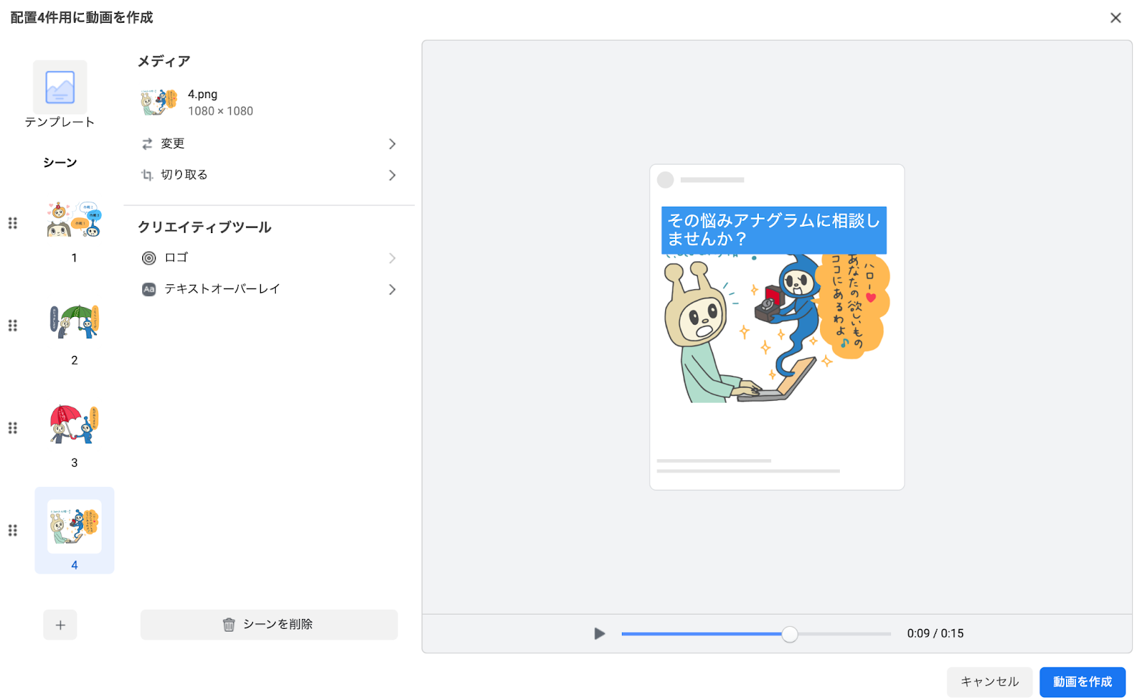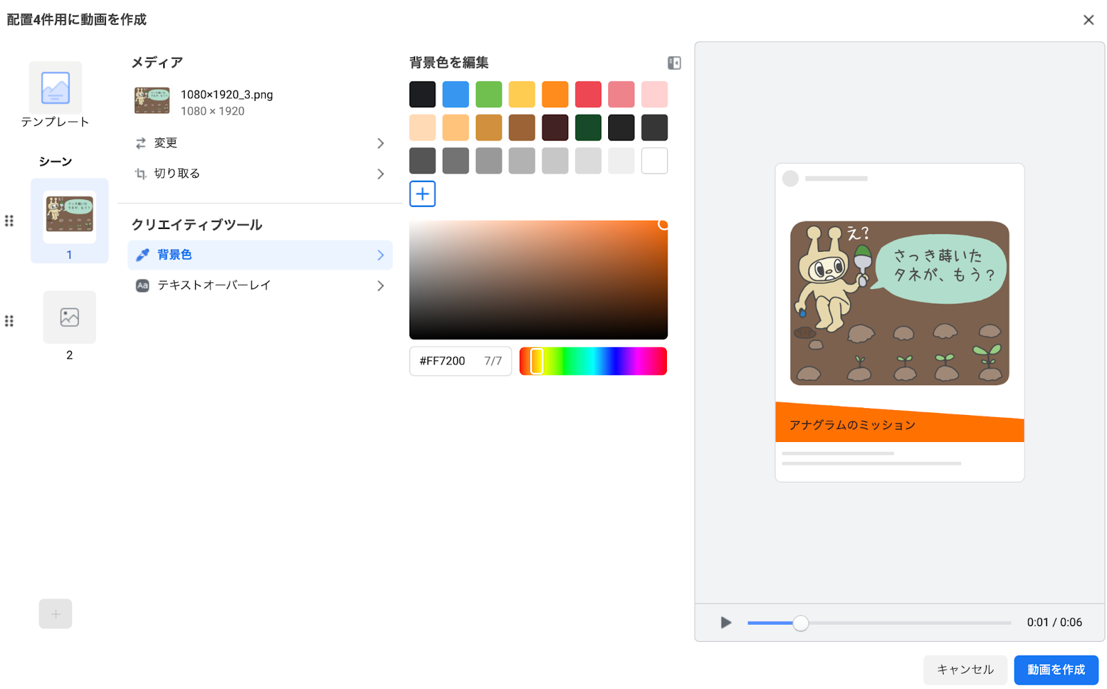 簡単な動画であればFacebook広告の管理画面上で作成から入稿までできる、非常に便利なツールです。