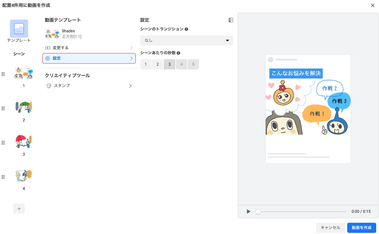 5.全てのシーンの設定を行い「動画を作成」をクリック。