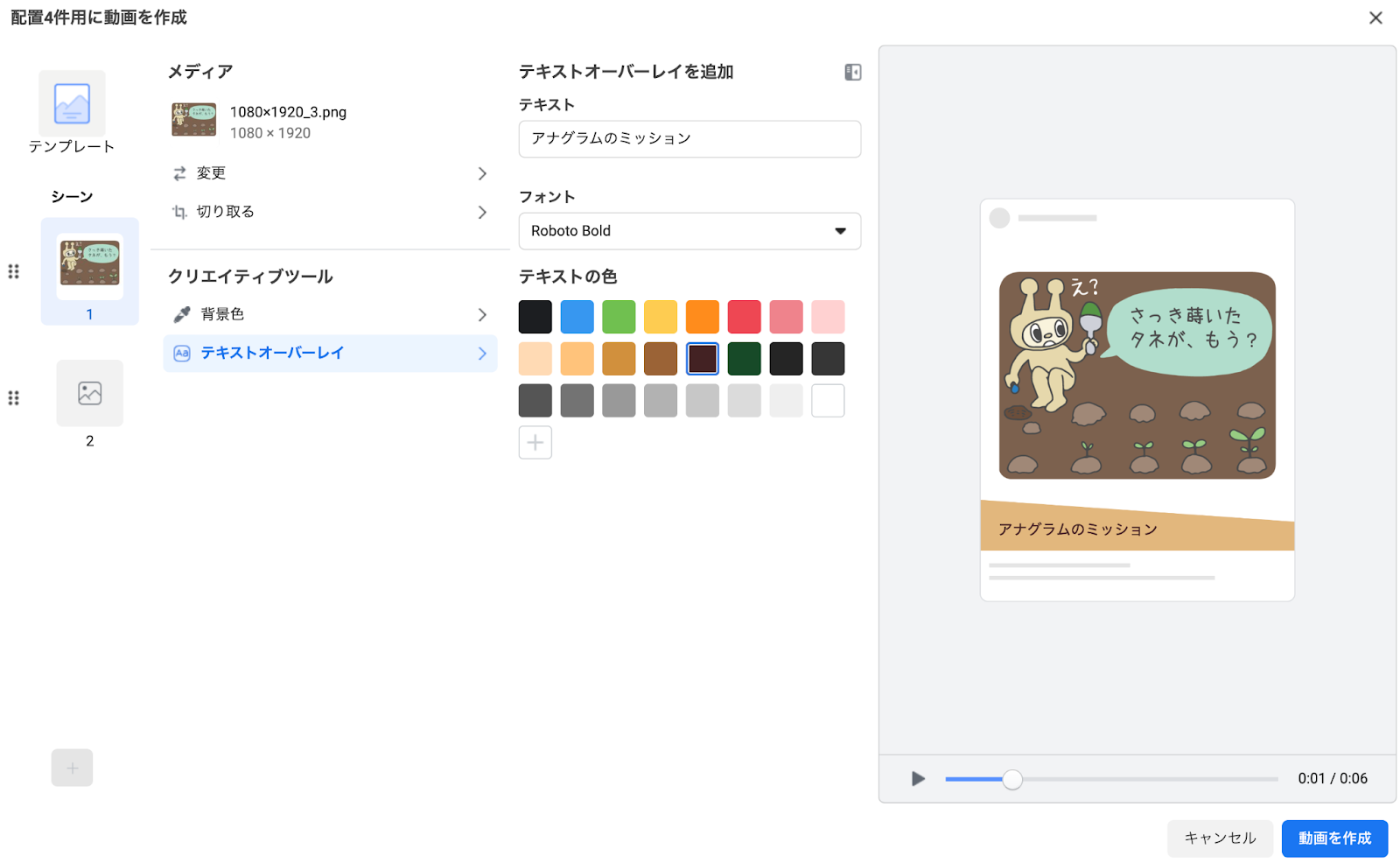 3.各シーンごとに編集を行う。テキストオーバーレイを選択するとテキストボックスとフォント、テキストカラー、背景カラーの選択画面が表示されるのでそれぞれ設定。