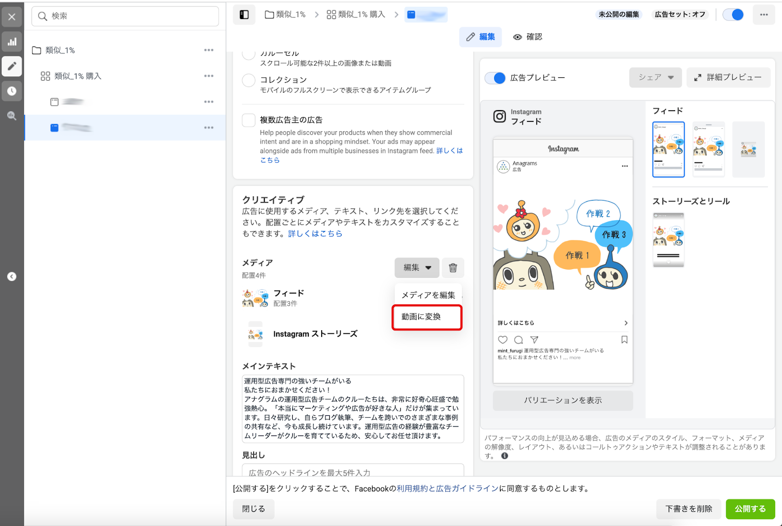 1. 広告作成画面からクリエイティブの「動画に変換」をクリック