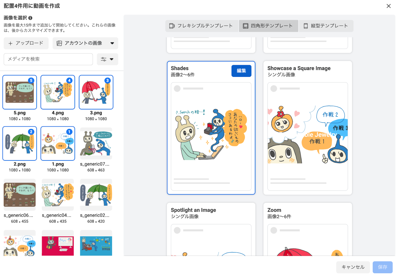 2.動画のテンプレートがそれぞれ表示されるので使用したいテンプレートと画像素材を選択し「保存」をクリック