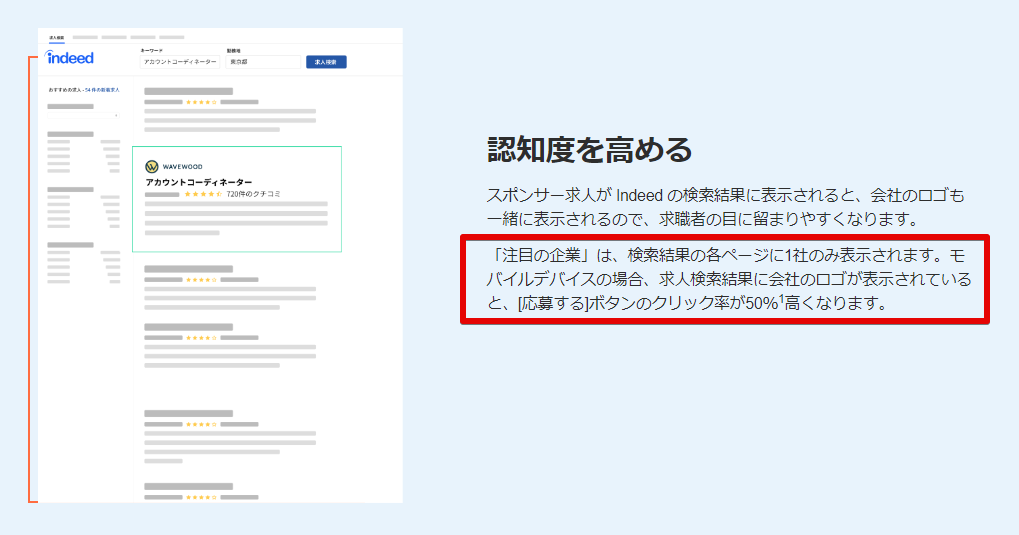 Indeedの調査では、「注目の企業」のロゴが表示されていると「応募ページに進む」ボタンのクリック率が50%も向上するといったグローバルでの事例もあるほど、非常に効果的な機能の1つとなっています。