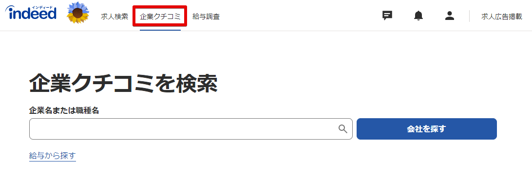 Indeed TOPページ左上にある「企業クチコミ」から自社の企業ページを検索しましょう。企業ページはアカウント作成時に自動的に作成されています。