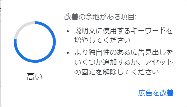 (広告の有効性はあくまで診断のためのツールです。オークションの要因ではありません。単に、検索語句に対して表示される可能性のある広告の組み合わせの数を最大化するために利用可能なアセットの多様性と関連性を示すのに役立つだけです。)