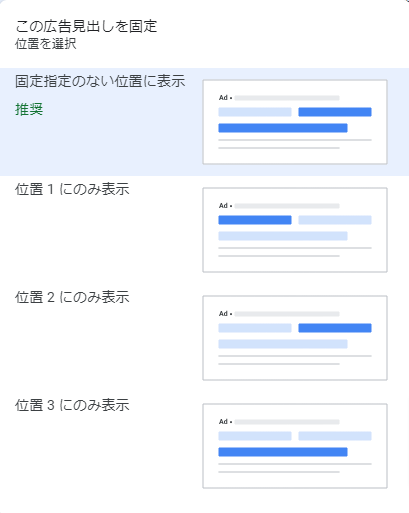 なお、見出し1と2をセットで表示させないと意味が通らない場合や、法的な理由やブランド上の理由で広告に特定の見出しテキストを含める必要がある場合には「固定(ピン留め)」機能の利用することで「見出し1のみ」の表示を回避できますので、検討してみましょう。