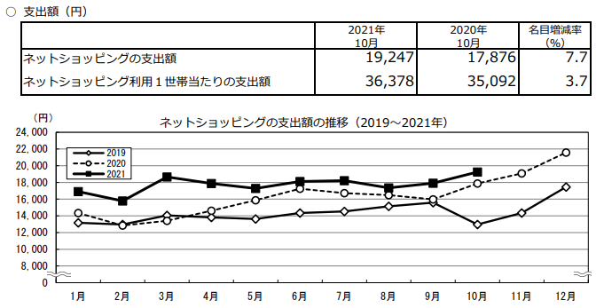 総務省統計局の最新データによると2021年には、オンラインショッピングの利用頻度とそこでの支出額が、前年に比べてわずかに増加したことが明らかになっています。