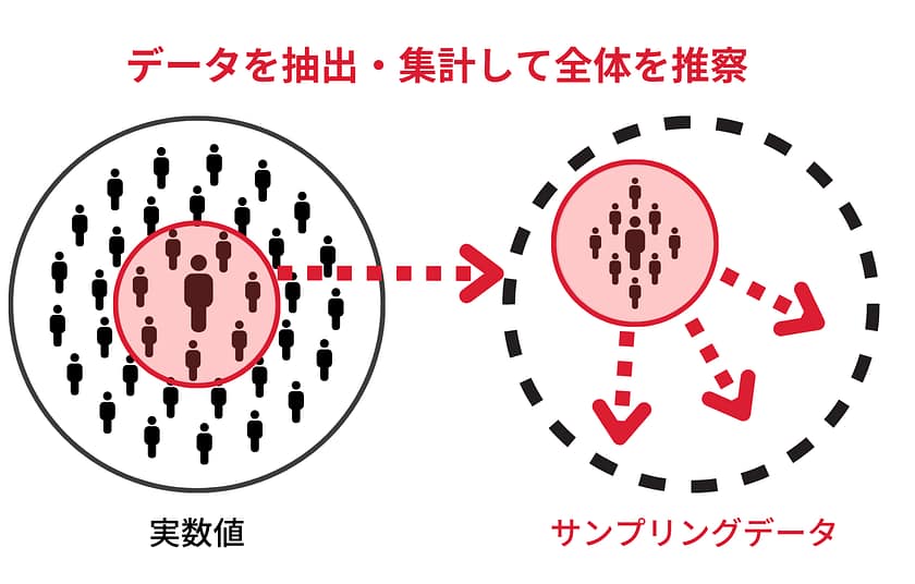 サンプリングとは、大量のデータを効率的に処理するために一部のデータを選んで分析に利用する方法です。たとえば、巨大な湖の水質を全て検査するのは困難なため、いくつかのサンプルを採取して全体の状態を推測する「サンプル検査」のようなイメージです。