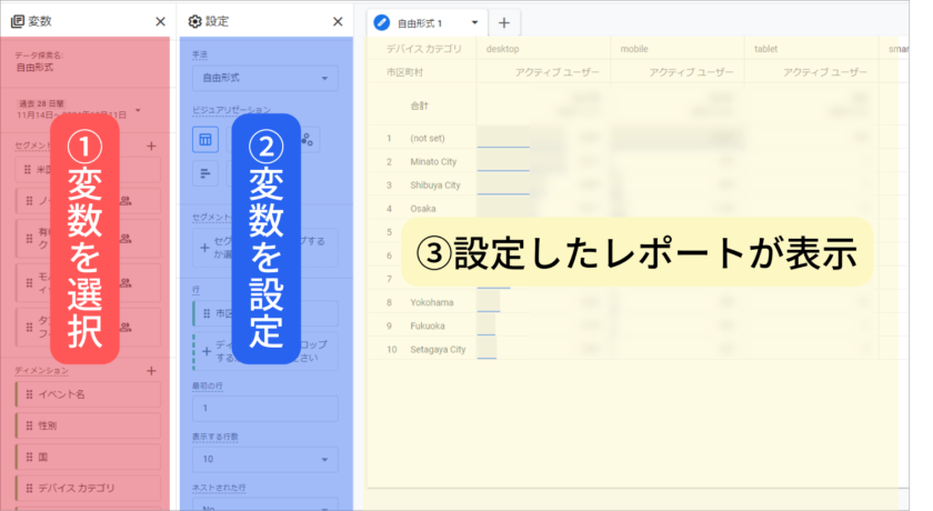 画面左側の「変数」列でセグメント・ディメンション・指標の3つを設定しましょう。