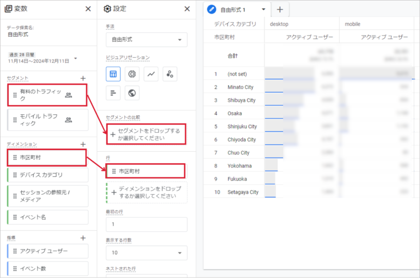 ①で選択した指標やディメンションをドラック&ドロップして設定します。