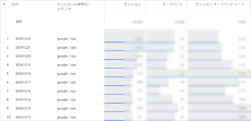 キーイベント(例: purchase、会員登録など)を基準に、日別でどの参照元/メディアが最も効率的に成果を上げているかを比較できるほか、キーイベント数やキーイベントレートが高い日を確認し、「なぜ伸びたのか?」「さらに成果を出すにはどうすればいいか?」といったマーケティング施策を検討することができます。
