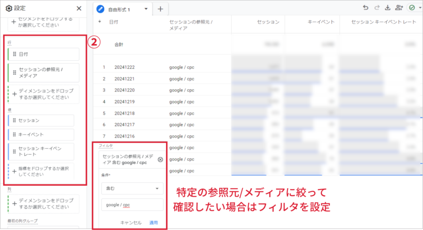 ②で設定した内容がレポートに反映されます。内容を確認して追加で足りない項目があった場合は、追加やフィルタリングなどしましょう。