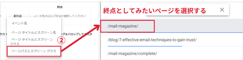 ②終点でページパスとスクリーンクラスをクリック、終点としてみたいページを選択する。下記はメールマガジンページの到達を終点として設定しています。
