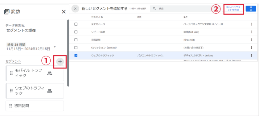 ②新しいセグメントを作成をクリックします。