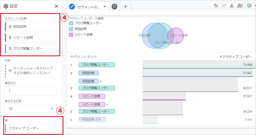 ④③で作成したセグメントを設定し、値は「アクティブユーザー数」を設定。