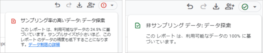 サンプリングが適用されているかどうかは、レポートの右上に表示されるため確認しましょう。サンプリングを避けたい場合は、データ量や期間を絞ることで防げる場合があるので、ぜひ試してみてください。