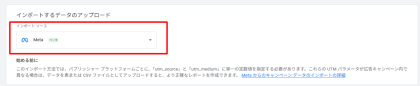6. 「インポートするデータのアップロード」で、インポートソースとして「Meta」を選択します