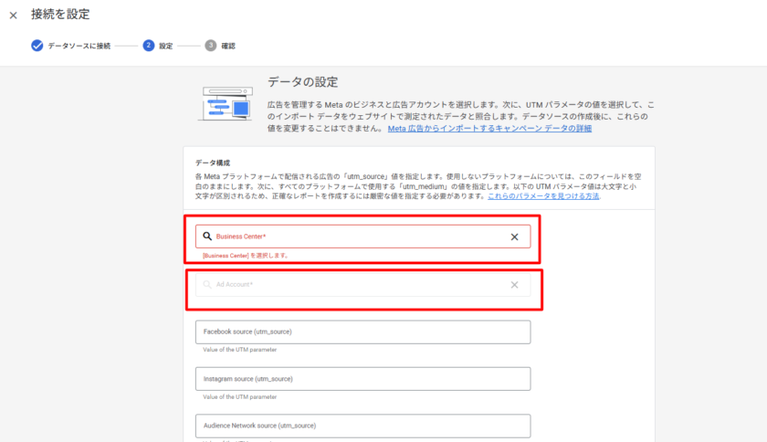 1. GA4のプロパティに取り込むMeta広告データを管理する「ビジネスセンター」と「広告アカウント」を選択します