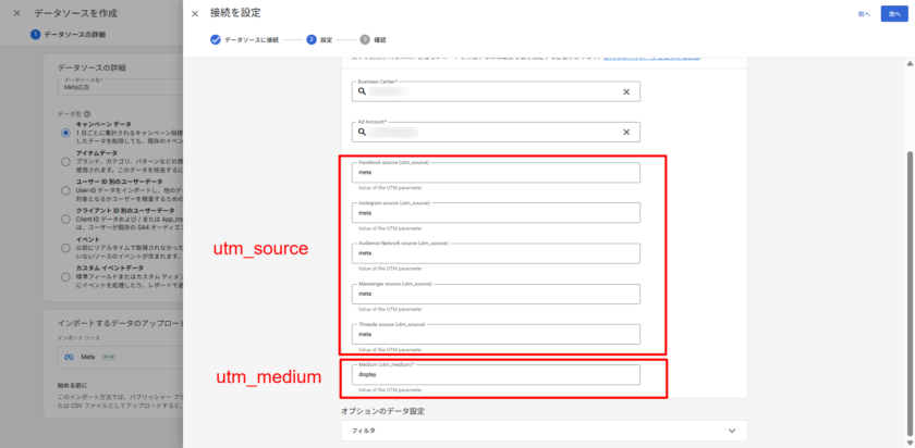 繰り返しになりますが、GA4の費用データインポート設定で入力する「参照元」「メディア」の値は、Meta広告のリンク先URLで指定したutm_source・utm_mediumパラメータ値と完全に一致している必要があります