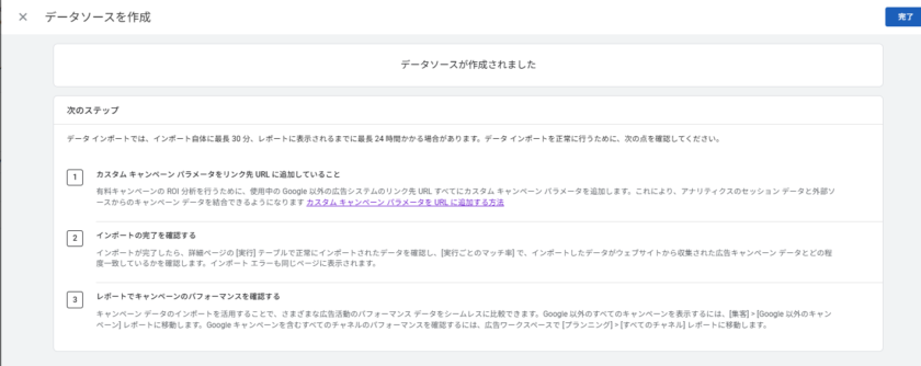 設定完了後、インポートが完了するまでには最長30分、データがレポートに表示されるまでには最長24時間ほどかかる場合があります。設定直後にデータが表示されなくても焦らず、翌日に再度確認するようにしてください。