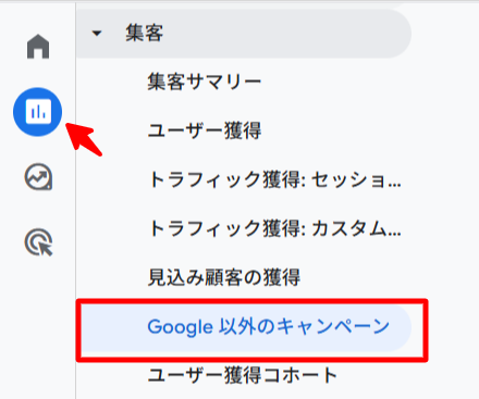 インポートした費用データは、GA4の「集客」>「Google 以外のキャンペーン」レポートで確認できます。このレポートでは、Google以外の有料マーケティングチャネルのセッション、費用、収益に関するデータが一覧表示されます。