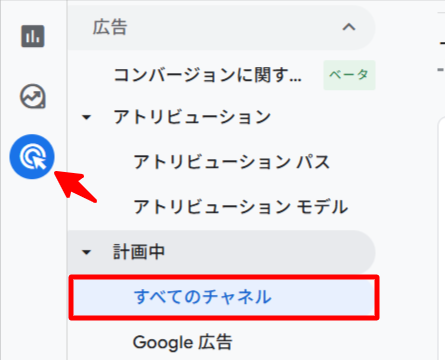 もうひとつの確認場所として、「広告」ワークスペースの「プランニング」>「すべてのチャネル」レポートがあります。こちらでは、Google広告を含むすべてのチャネルを横断的に比較分析できます。