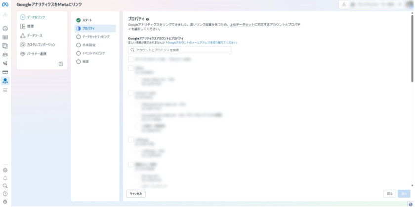 5.MetaにリンクするGA4アカウントおよびプロパティを選択します。