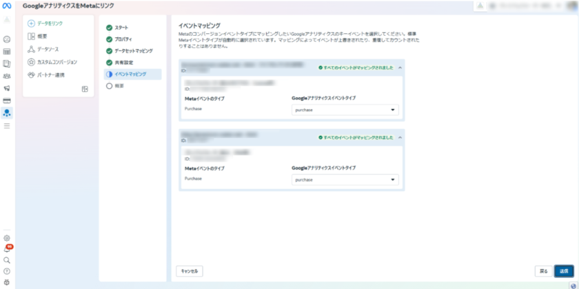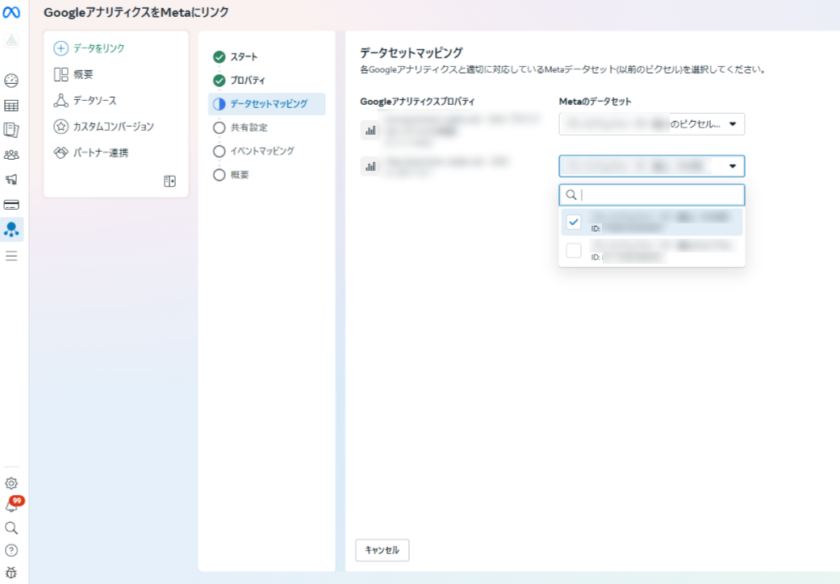 6.次はデータセットのマッピングです。GA4のプロパティごとに、使用しているMetaのデータセット(ピクセル)を選択します。