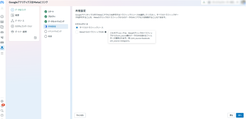 「すべてのトラフィックソース」もしくは「Metaからのトラフィックのみ」を選択できますが、より多くのデータを活用したほうが最適化に使えるデータ量が増えるため、「すべてのトラフィックソース」を選ぶことをおすすめします。