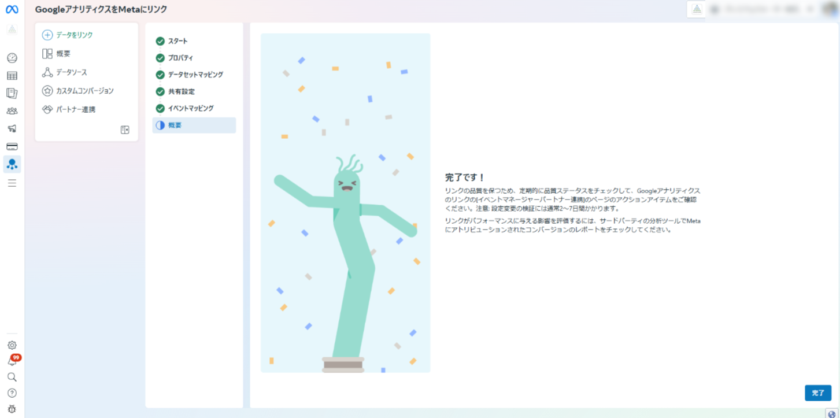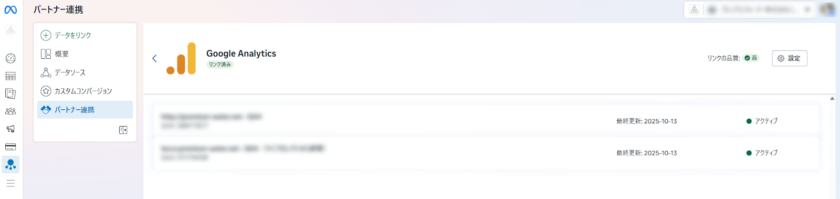 まずは、GA4とMetaの間でデータが正しく共有されているかを確認します。「リンクの品質」が高い状態であれば問題ありませんが、低い場合は何らかの設定不備がある可能性があります。