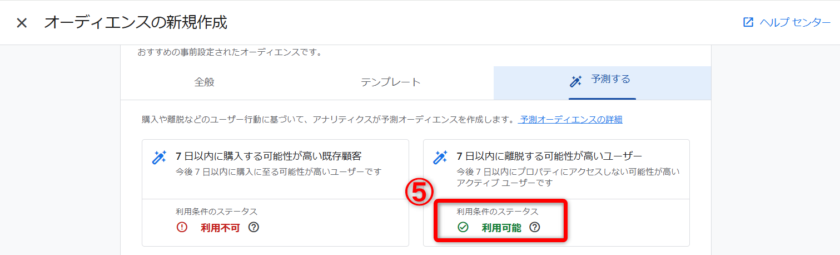 この条件を満たしていないと予測オーディエンスも作成できません。前提条件を満たすことで、オーディエンス作成ツールやデータ探索ツールで予測指標を活用できるようになります。