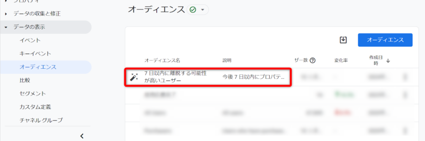 「7日以内に離脱する可能性が高いユーザー」の予測オーディエンスがデフォルトで作成されます。