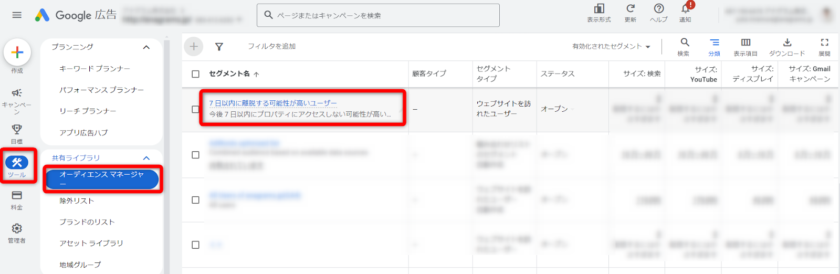 また、GA4とGoogle広告が連携されている場合は、Google広告ログイン後に「ツール」を選択し「共有ライブラリ」の「オーディエンスマネージャー」で作成したオーディエンスの確認が可能です。