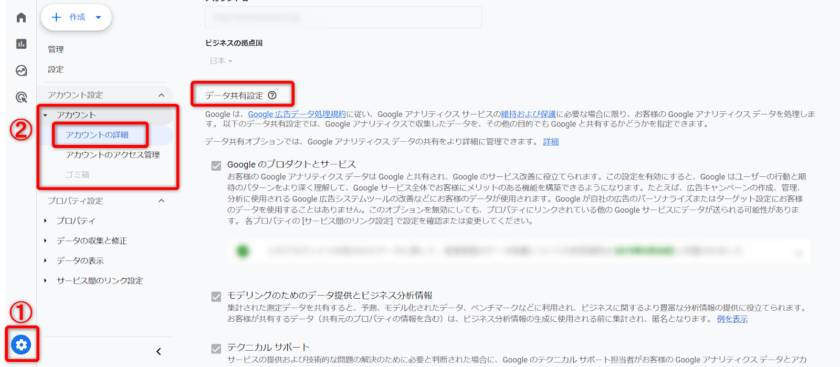 ①「管理」から②「アカウント」内の「アカウントの詳細」を選択して、データの共有状況の「Googleのプロダクトとサービス」がチェックされているか確認しましょう。変更する場合は、設定をチェックの有無を変更し保存をします。