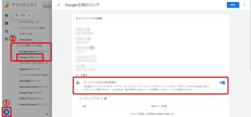 ①「管理」から②「サービス間のリンク設定」内の「Google広告のリンク」をクリック。編集するリンクされたGoogle広告アカウントを選択することでパーソナライズド広告が有効化されているか確認できます。