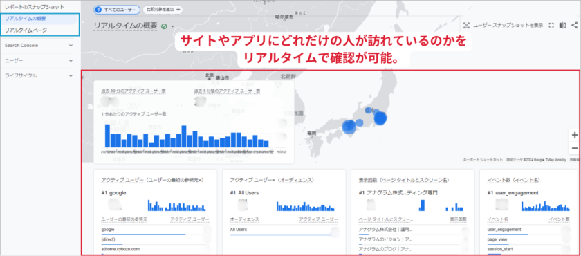サイトやアプリに訪れているユーザー数や行動、訪問元、閲覧ページなどをリアルタイムに確認でき、ユーザー動向を把握できます。