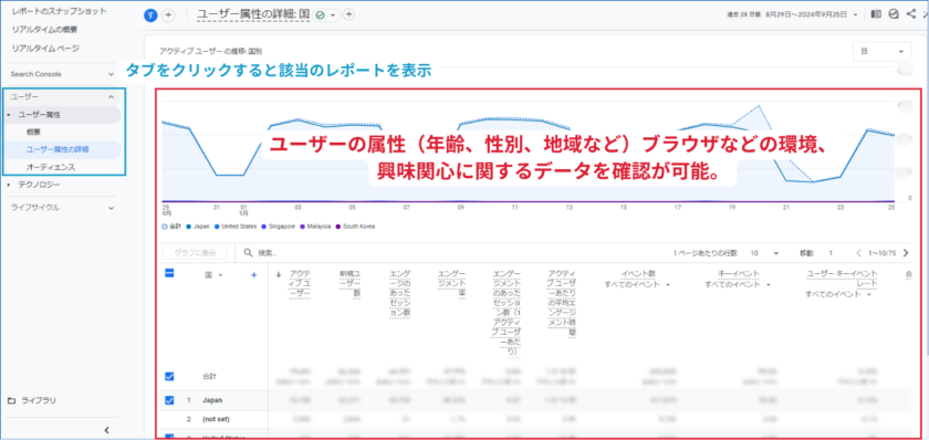GA4ホーム画面「レポート」>「ユーザー」>「ユーザー属性」>「概要」をクリックで閲覧できます。
