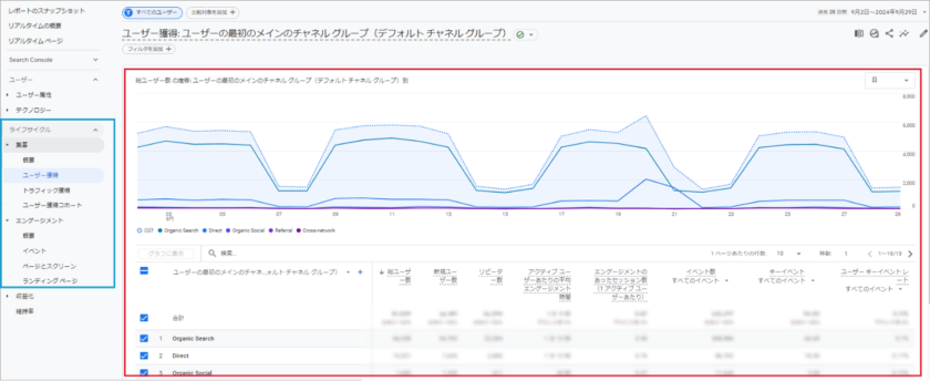 「ユーザー獲得」では、ユーザーがどこ(チャネル、参照元、メディア)から初めて訪問したかを確認できます。
