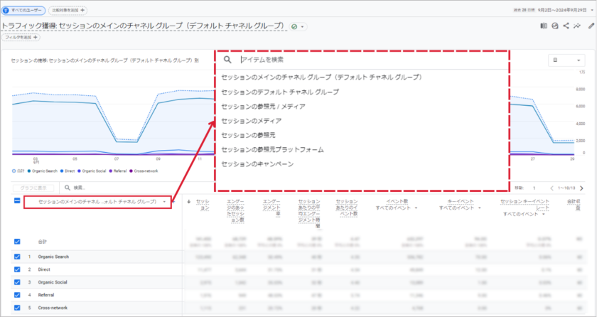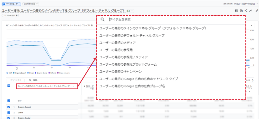 デフォルトでは「ユーザーの最初のメインのチャネル グループ」が表示されます。 これは、ユーザーがサイトに最初にアクセスした際のチャネルを大まかに分類したものです。 例えば、「Organic Search」は自然検索結果からの流入、「Direct」はブックマークやURLの直接入力からの流入を意味します。