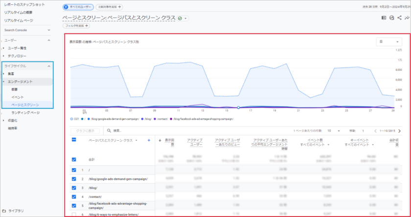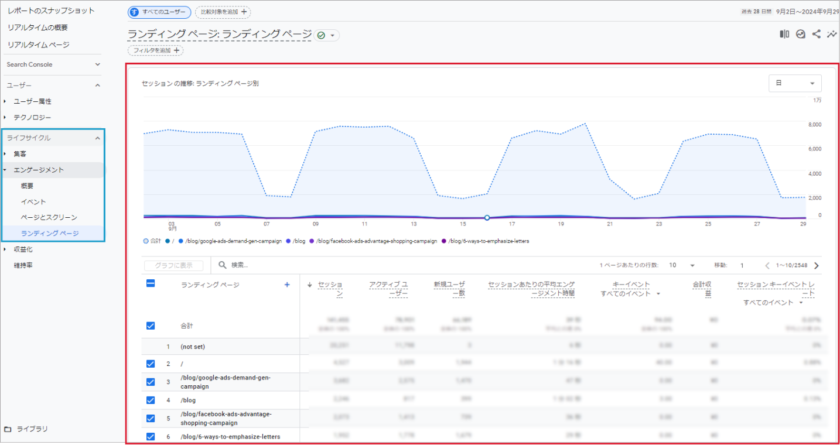 GA4ホーム画面「レポート」>「ライフサイクル」>「エンゲージメント」>「ランディングページ」をクリックで閲覧できます。